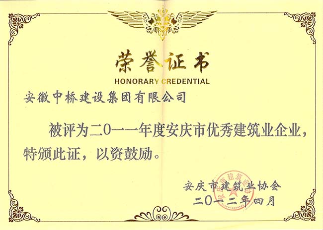 企业荣誉 当前位置: 网站首页 > 中桥文化 > 企业荣誉 安庆市优秀建筑业企业 时间:2014-11-03 10:48作者:admin 点击: 次 ------分隔线---------------------------- 上一篇:暂无 下一篇:安徽省优秀建筑业企业 收藏 推荐 打印