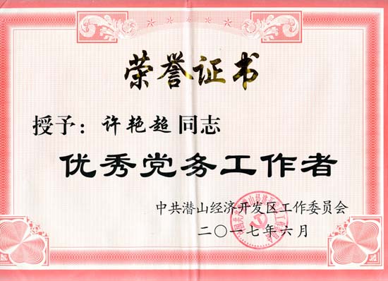 喜讯 时间:2017-07-06 16:35作者:admin 点击: 次 6月30日,县经济开发区党委召开建党96周年表彰大会,我司许艳超同志获“优秀党务工作者”,金前方、金红燕同志获 “优秀共产党员”荣誉称号。 ------分隔线---------------------------- 上一篇:和利公司荣获省“守重”企业荣誉称号 下一篇:中桥集团帮扶资助贫困大学生 收藏 推荐 打印